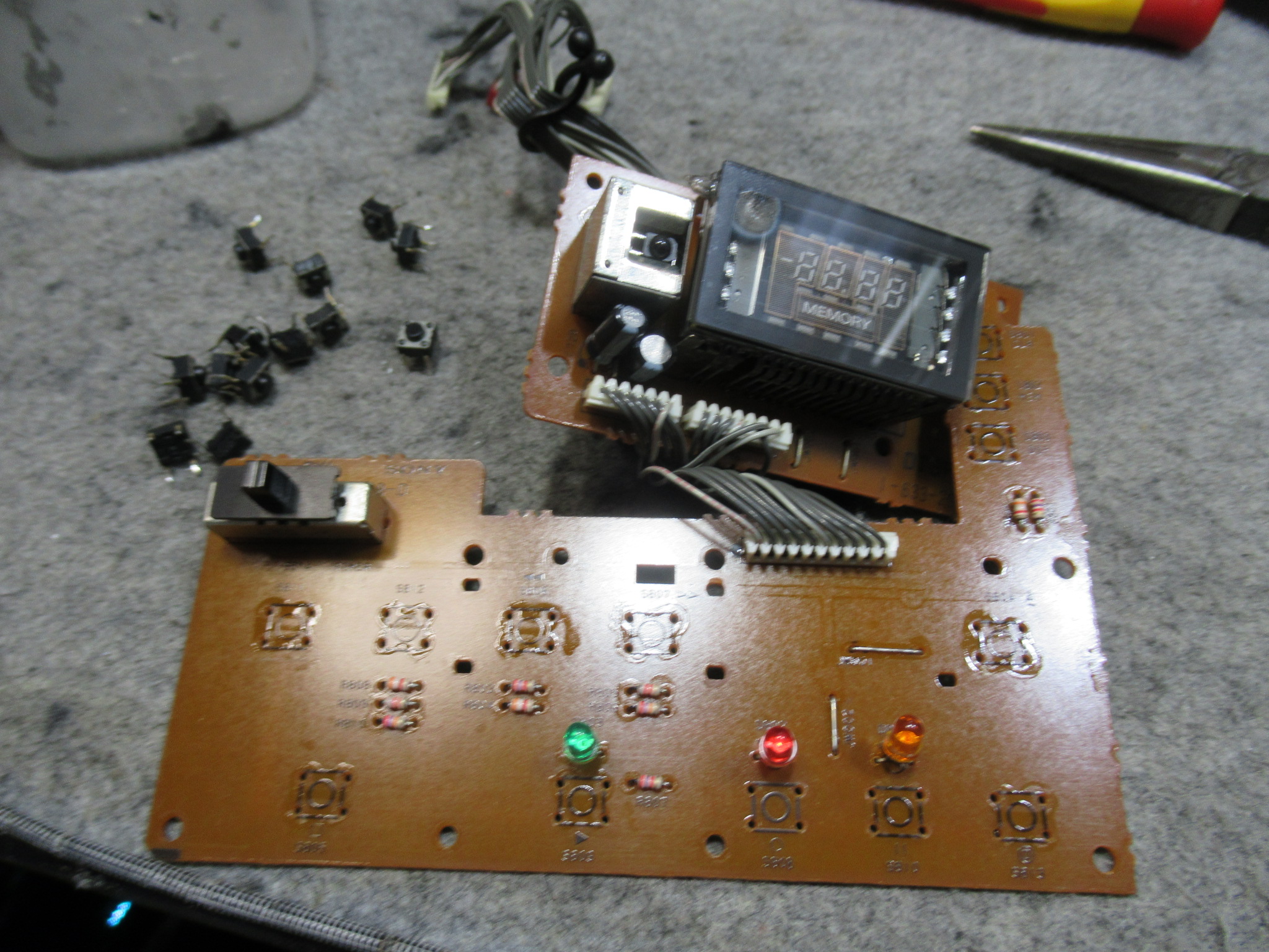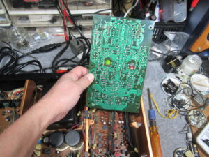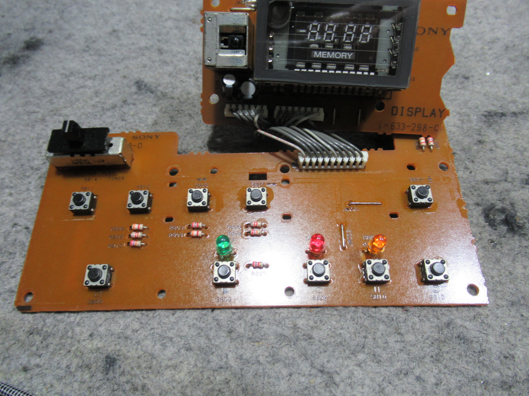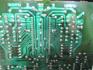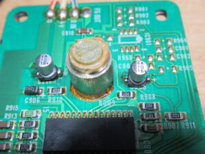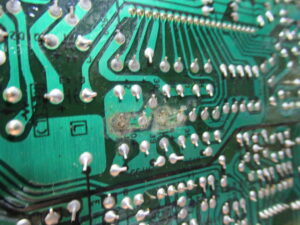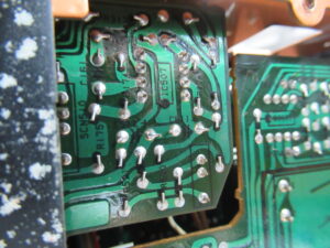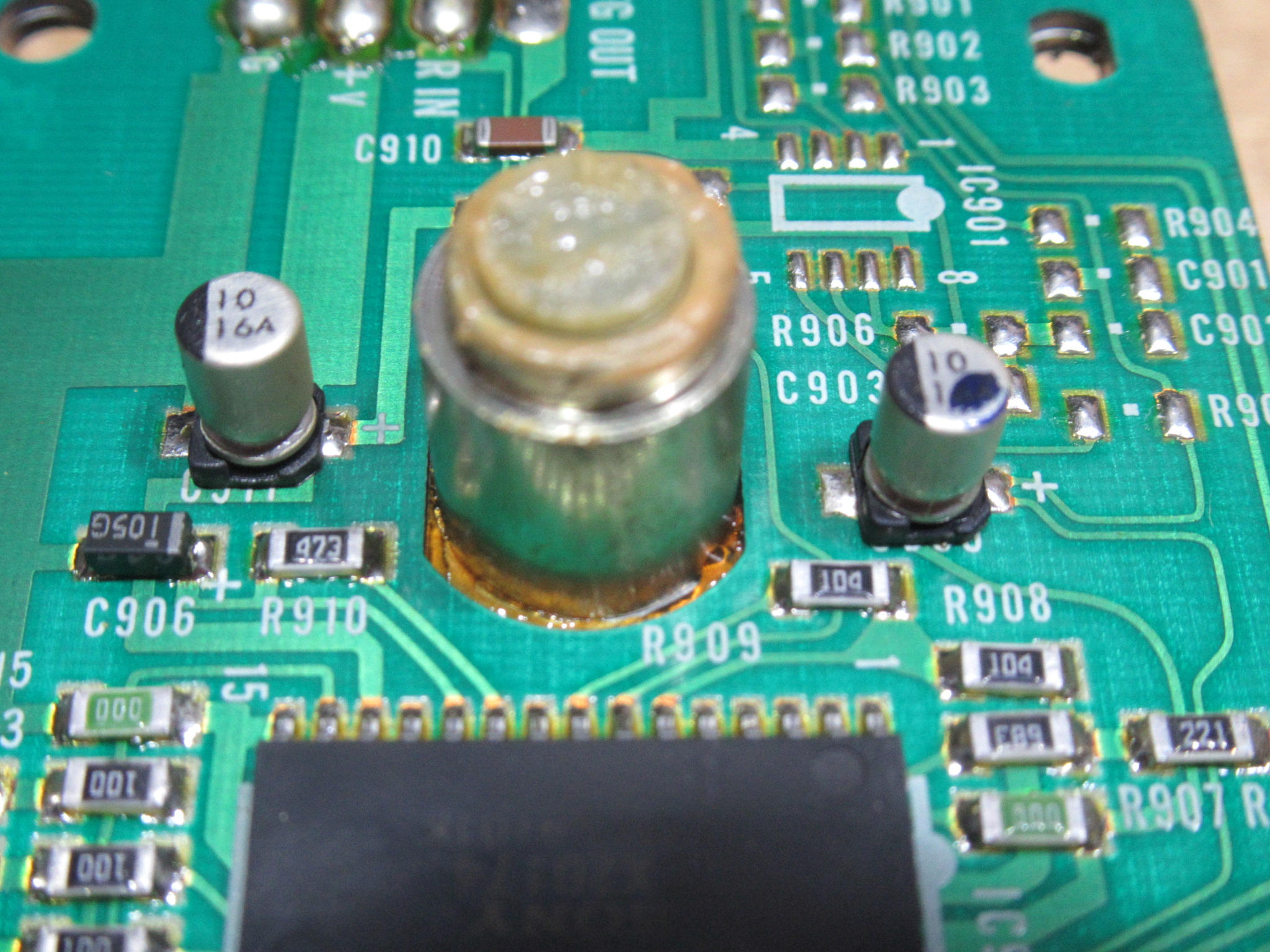 録音基板が電解コンデンサーの液漏れで白く汚れています。