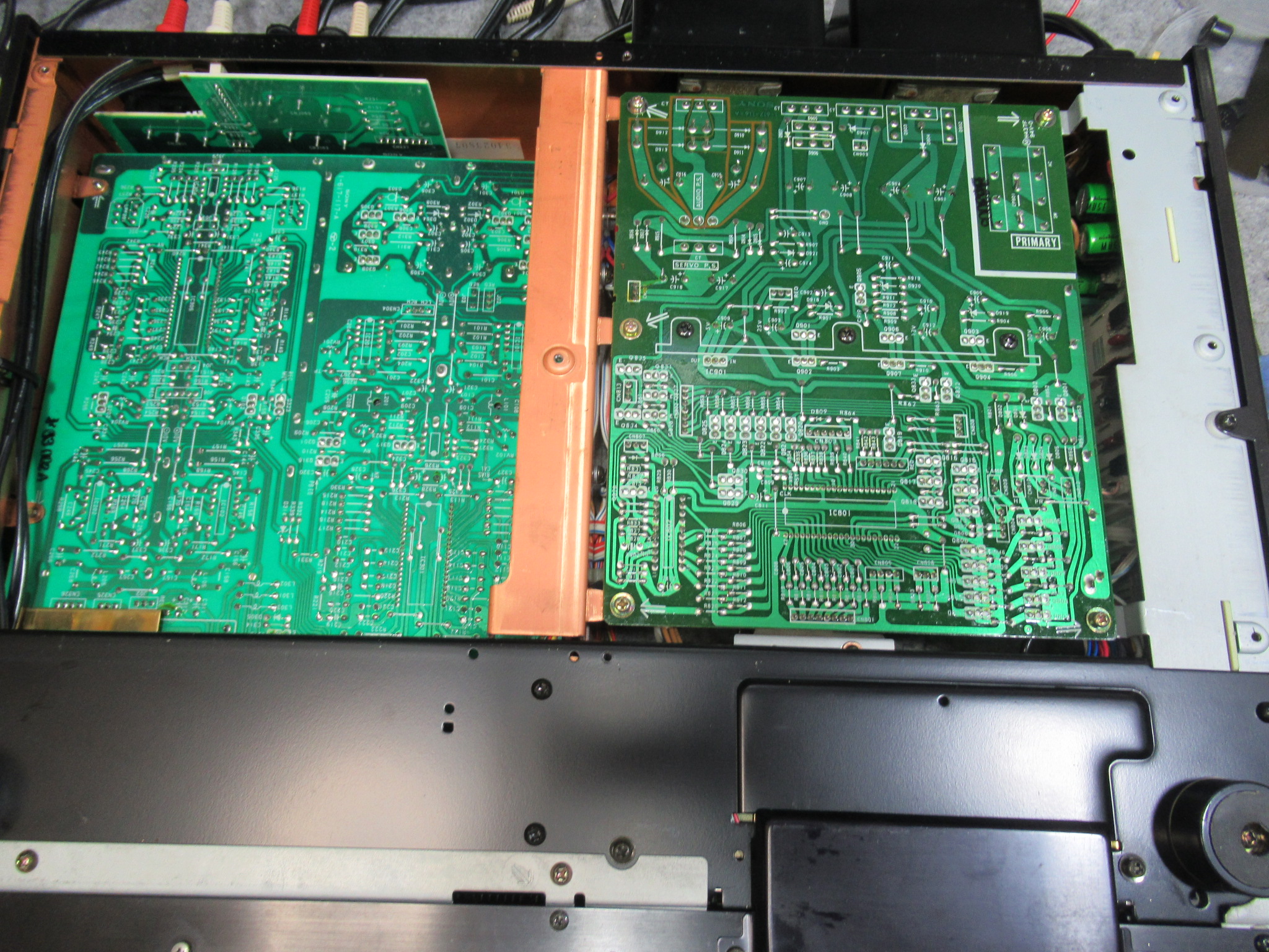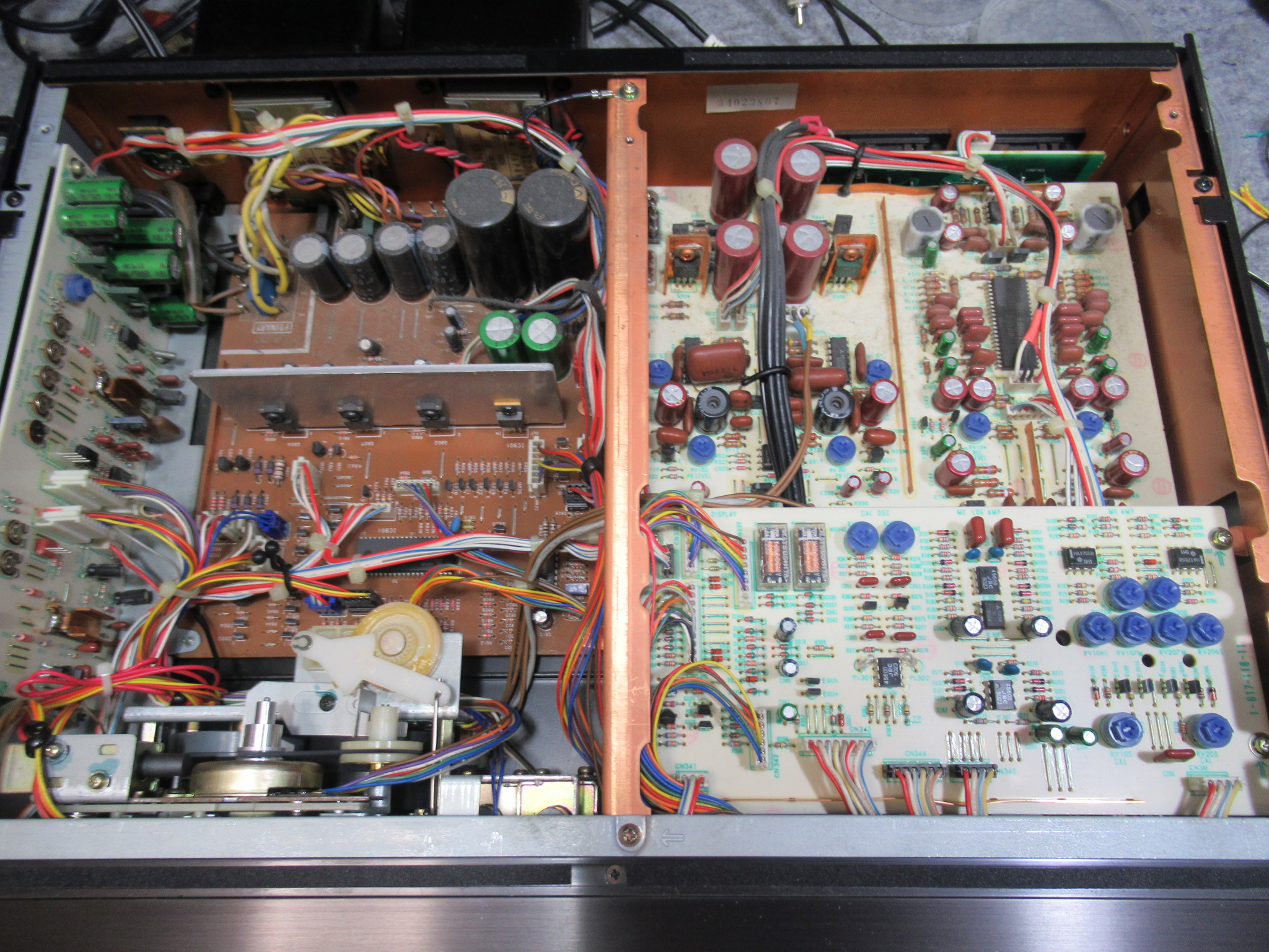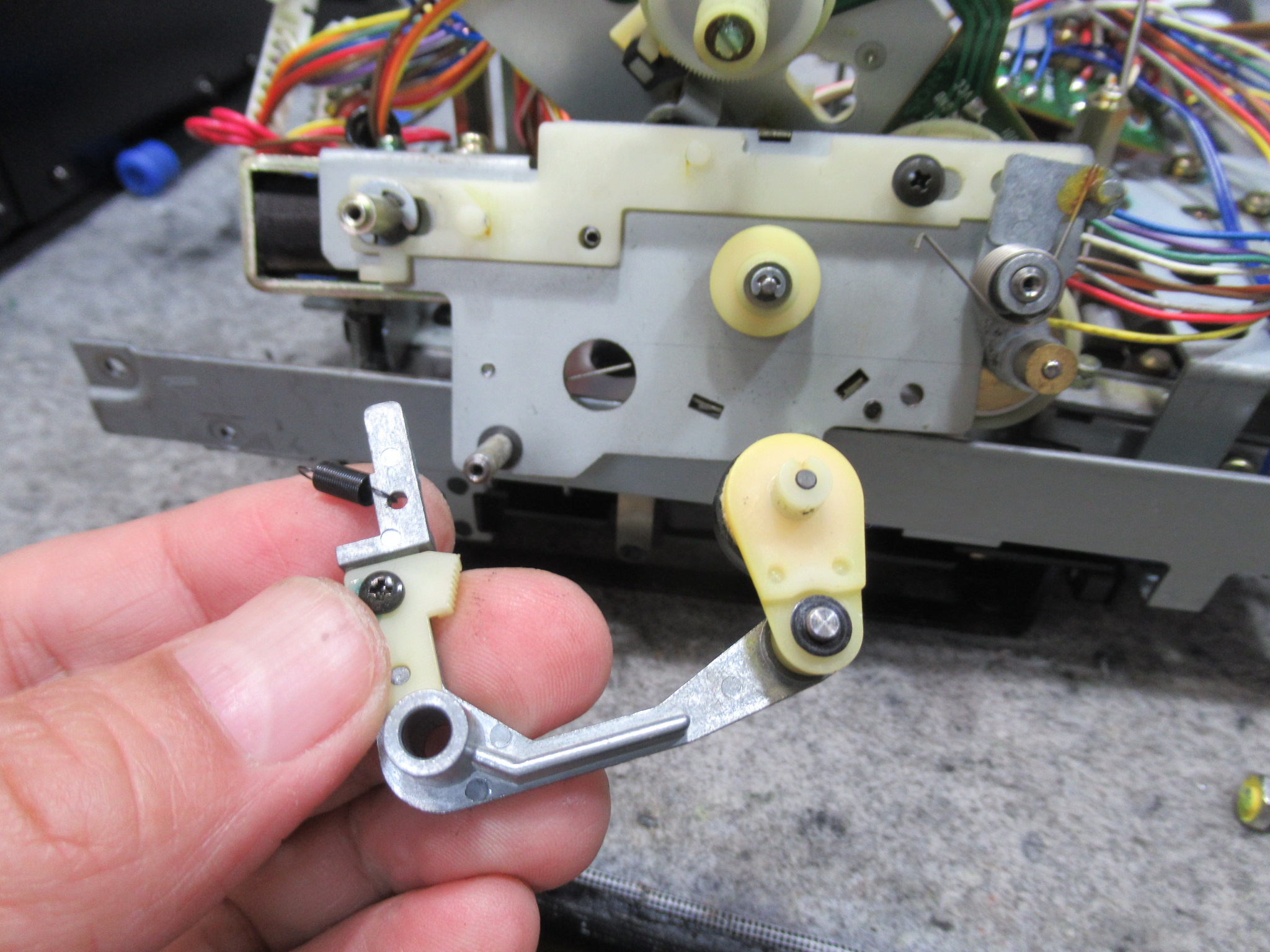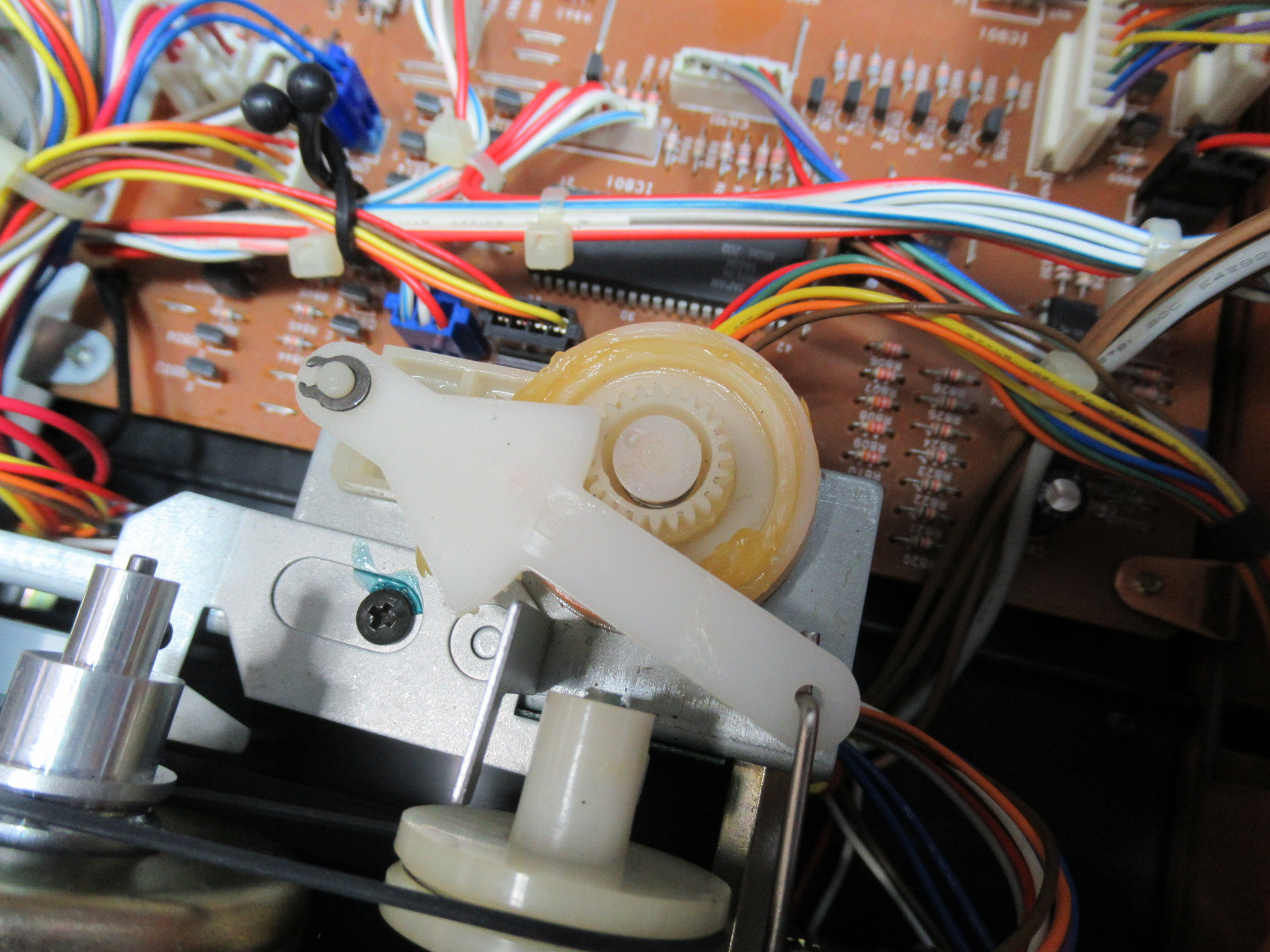 中央に見えるのがトレイが開くときの衝撃を緩和するオイルダンパーですが、部品入手が叶わないため処置はできません。