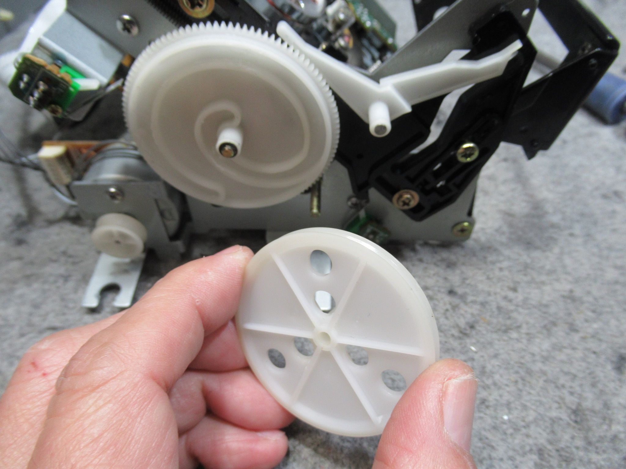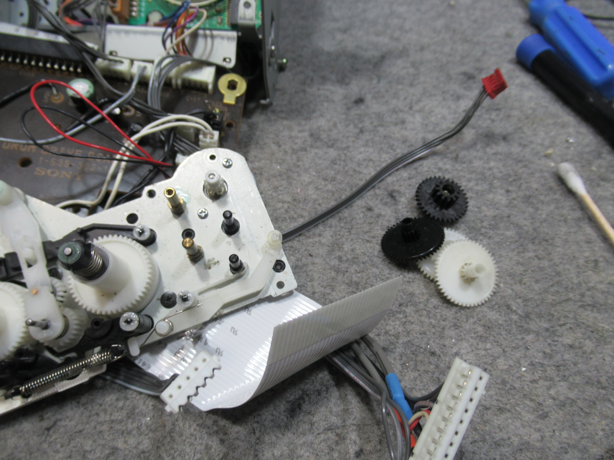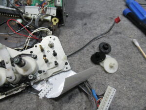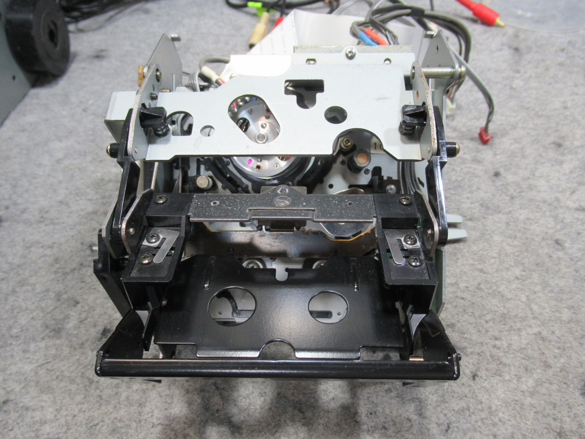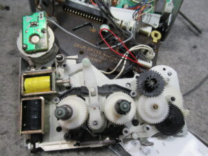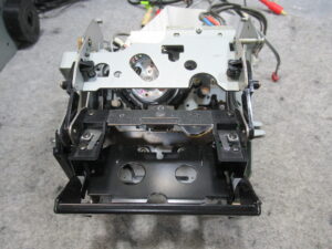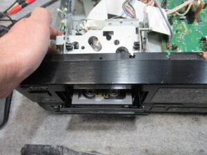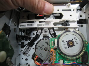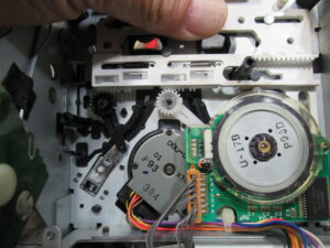 カバーを開けて指でローディングプーリーを回してトレイを開き、テープ救出、リッドを取り外しを行います。
