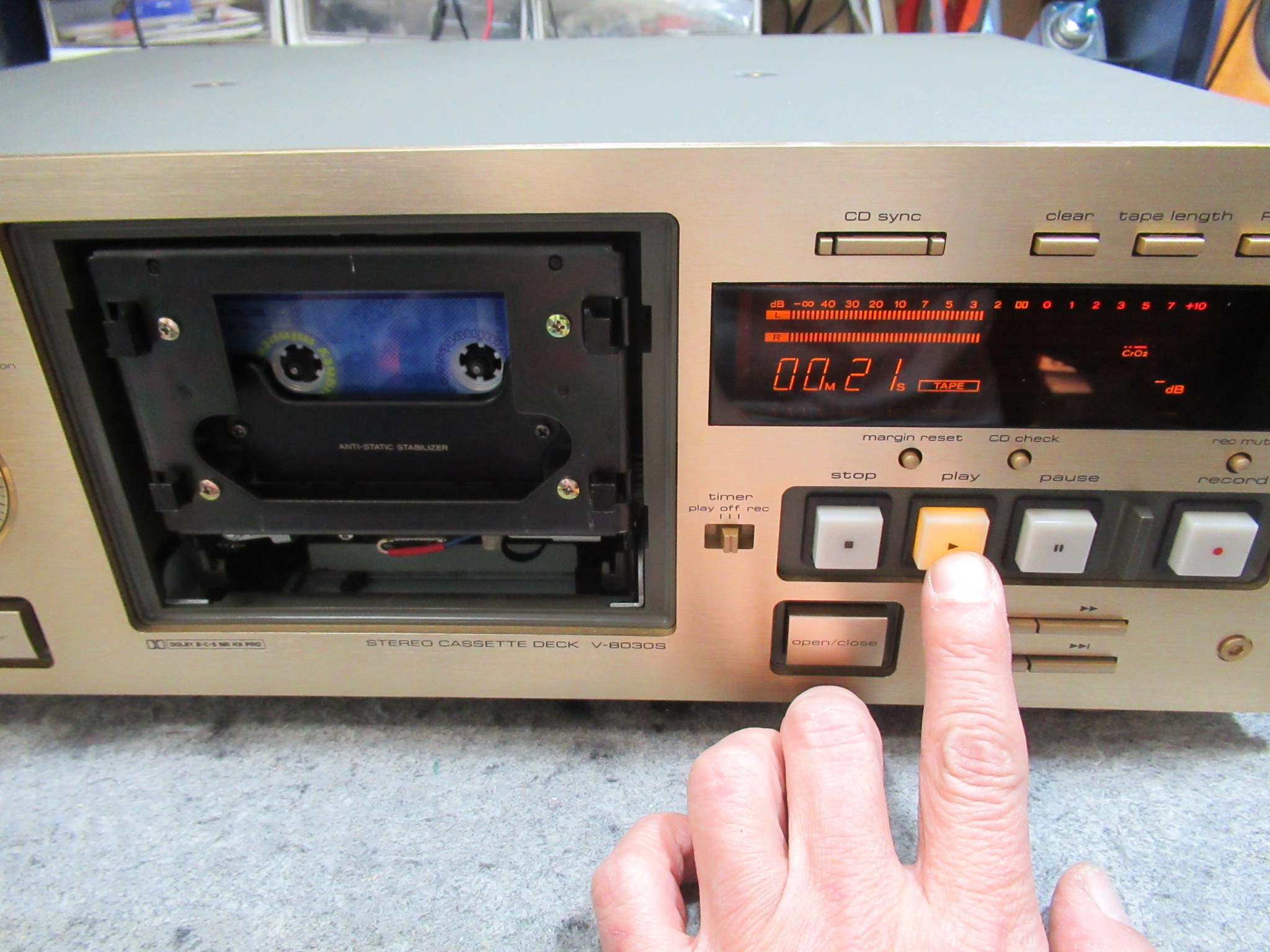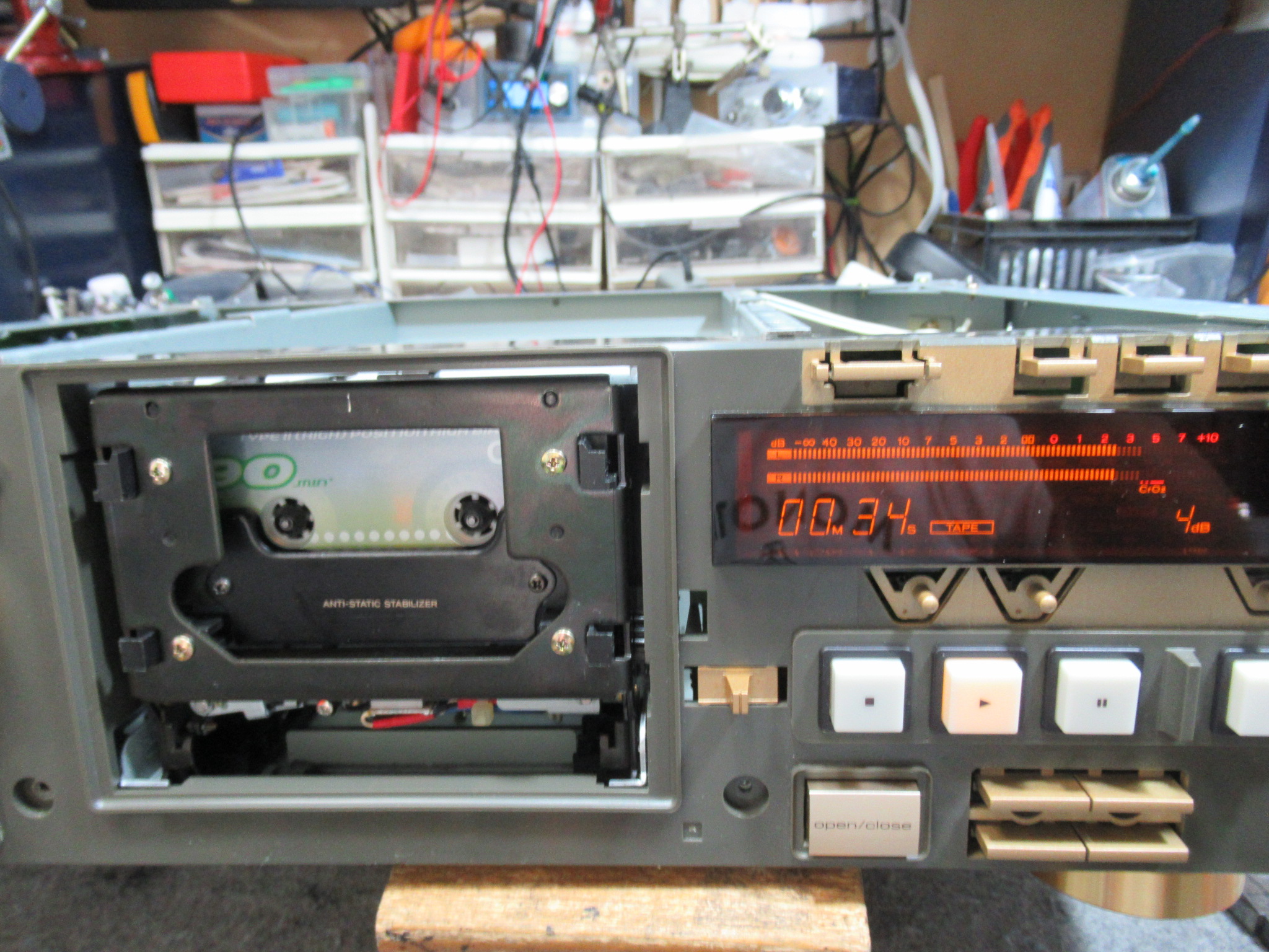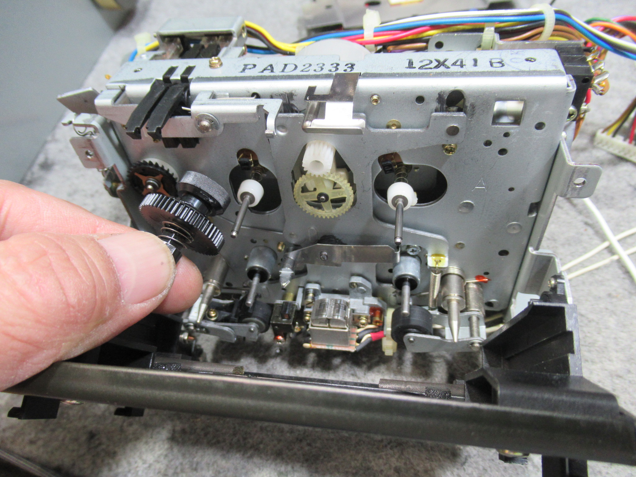 ところが、改めて動作確認を行うと、お話にあった症状が発生しました。一瞬音は出ますが、カタカタ音がテープの辺りから発生し、すぐに停止します。