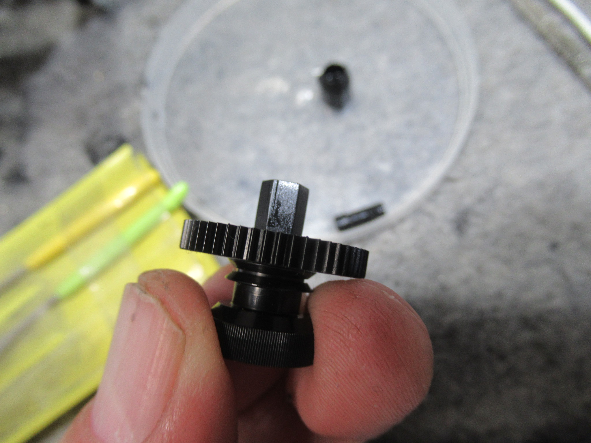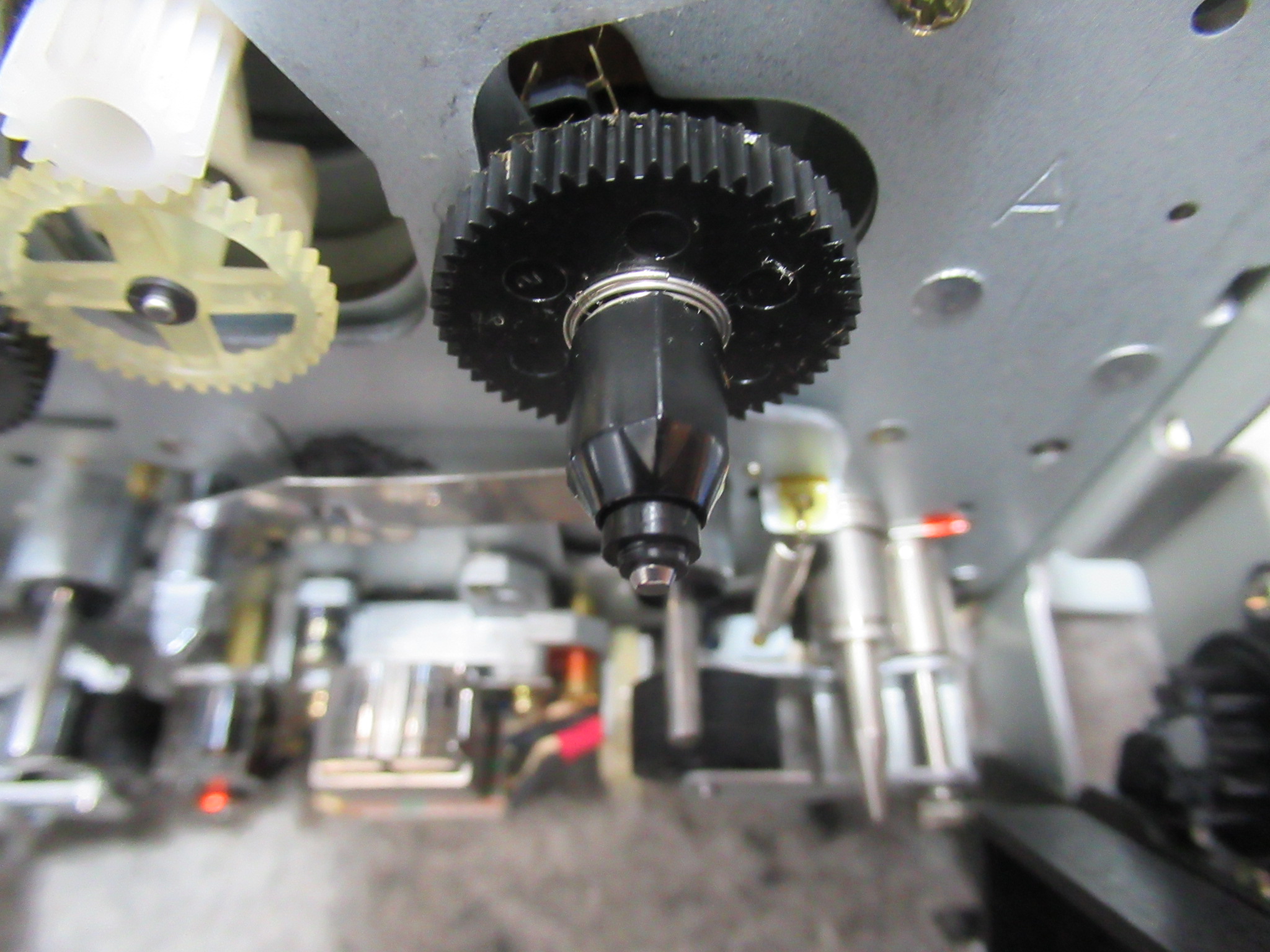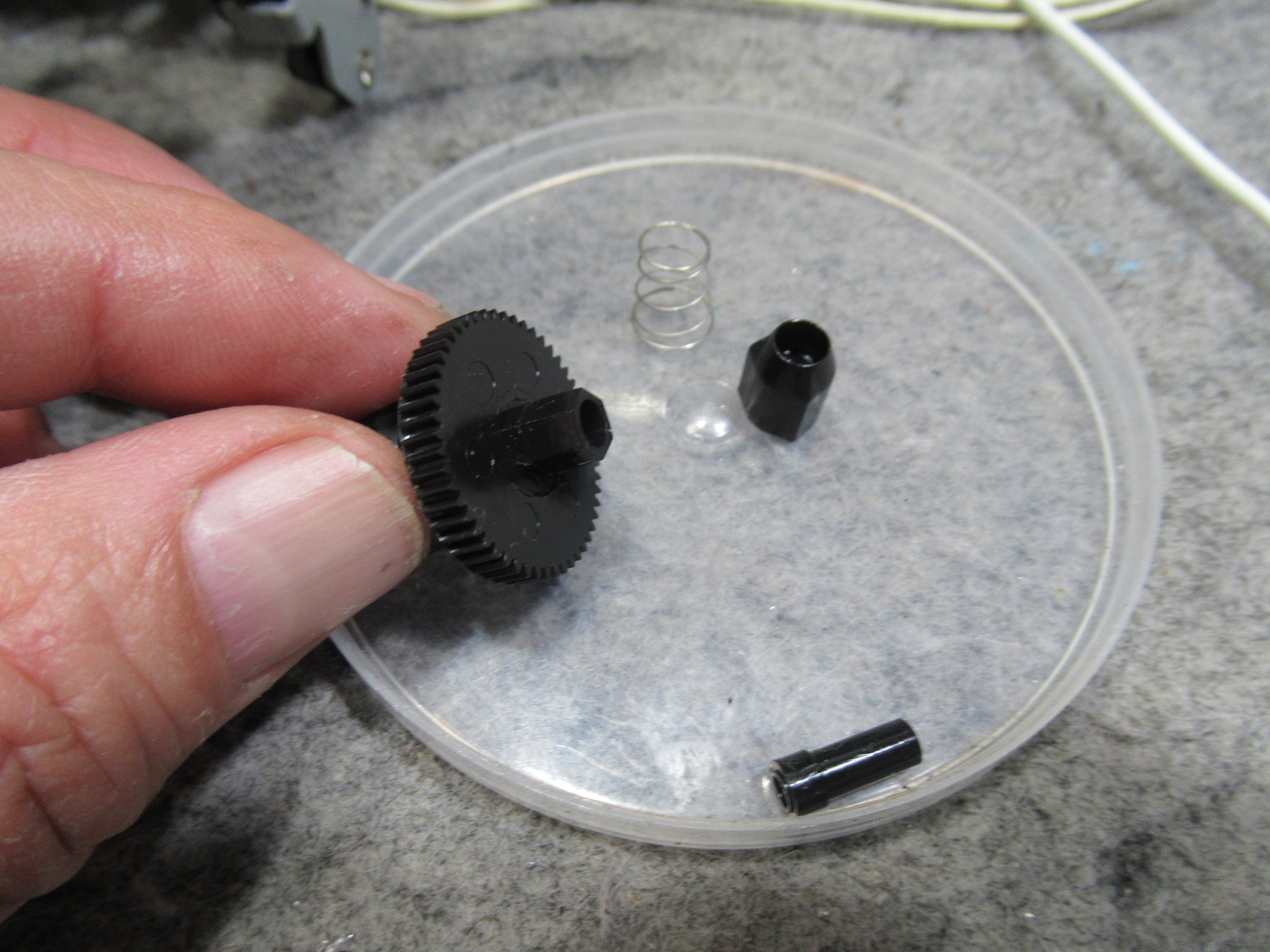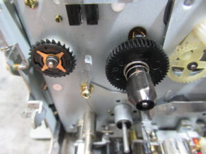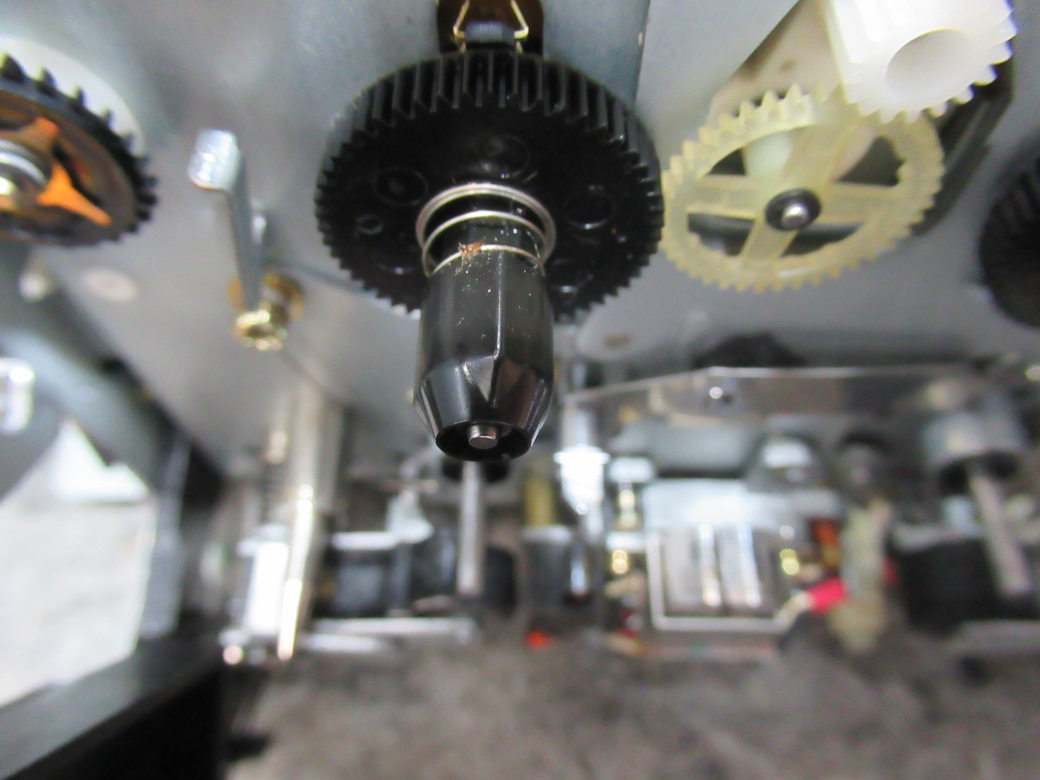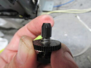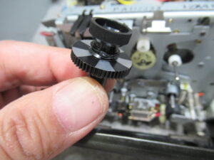 右側のリールを分解します。先端部はカセットのハブとスムーズに組み合わさるように可動式になっていますが、プラスチックがひび割れて擦れていましたので、ヤスリ掛けして形状を修正します。