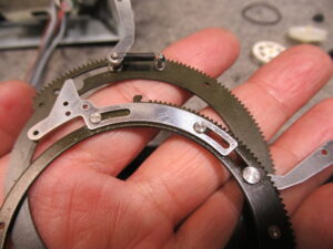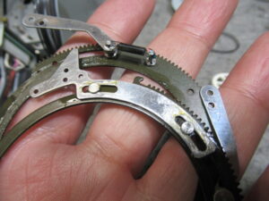 可動式のテープガイドを駆動するリングギヤですが、グリスが硬化して固着しています。CRCで古いグリスを除去し、注油します。