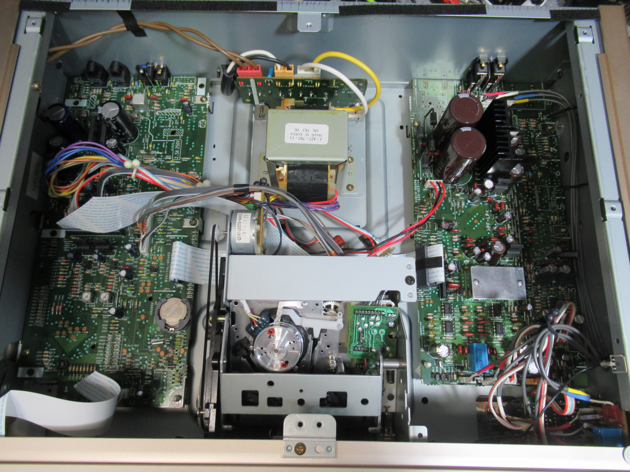 SONY製DATデッキ、DTC-ZA5ESです。 数年前からイジェクト不良となったため、その後はDACとして使用していたということです。 モーター音は聞こえますがリッドが開きません。 カバーを開けます …