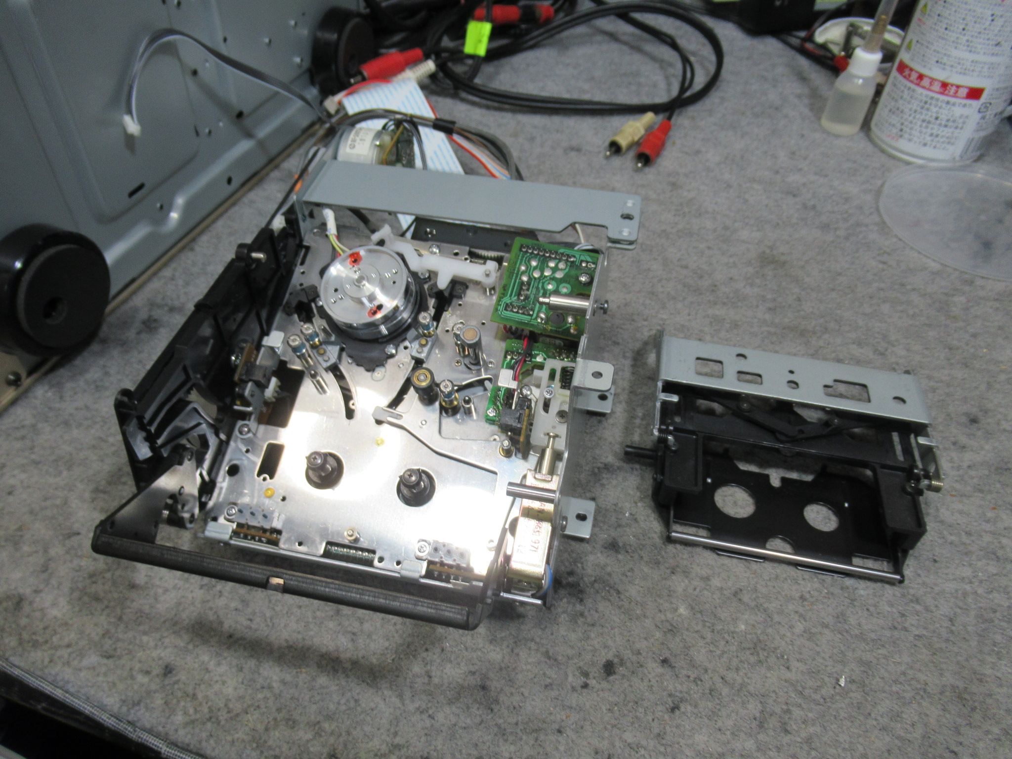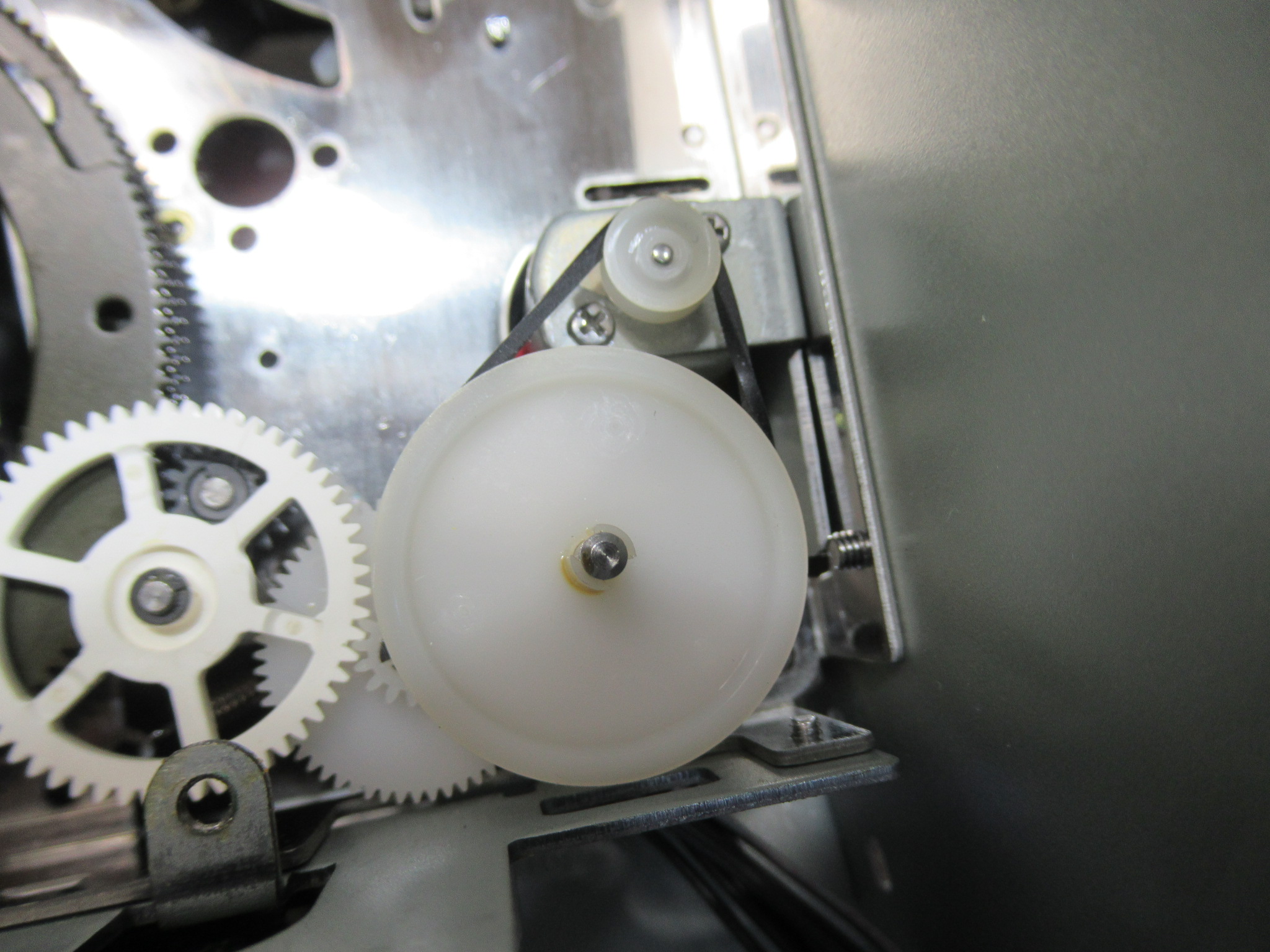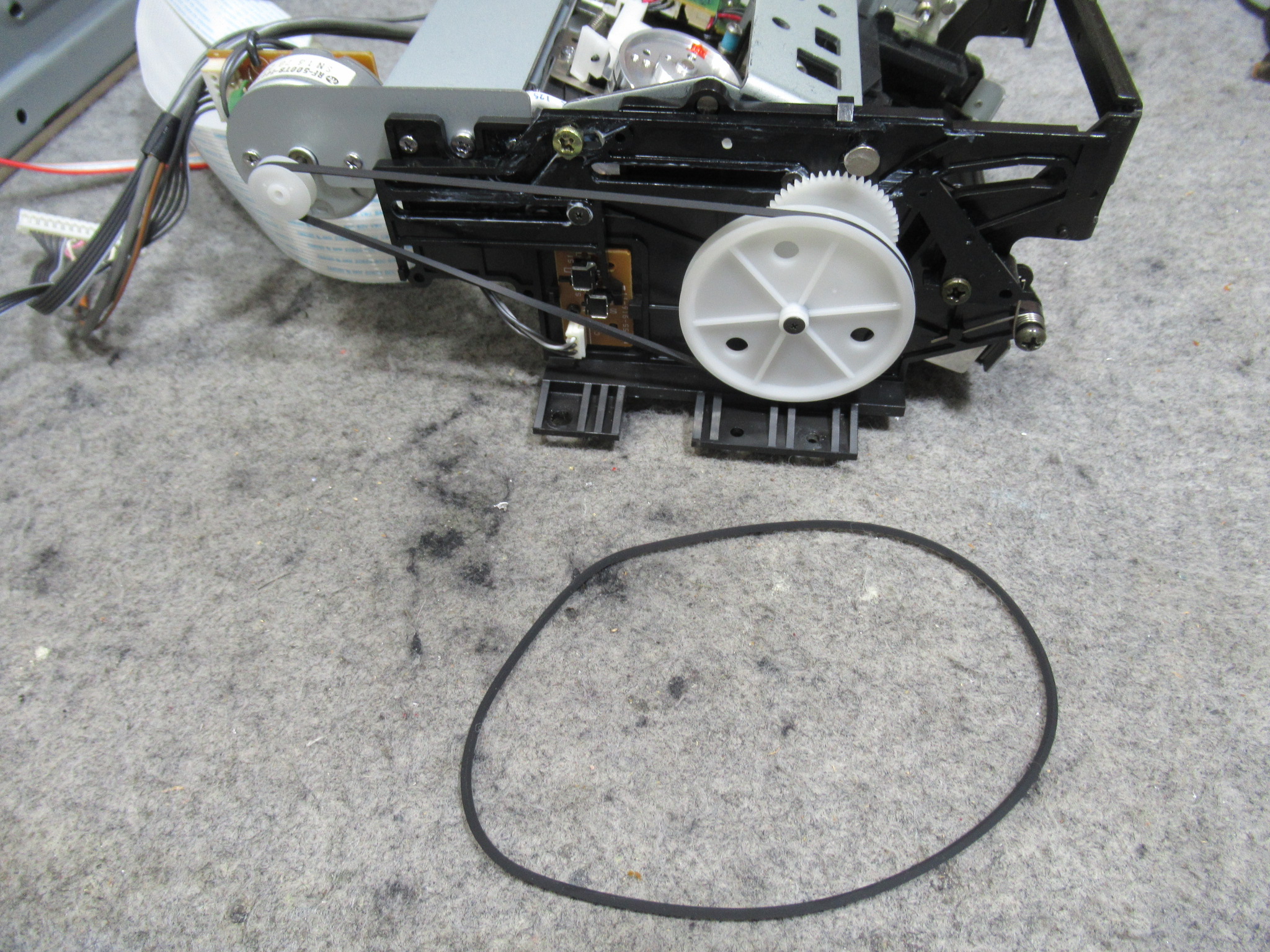 メカを降ろして、まずは、トレイ開閉の不具合の原因のひとつ、劣化したローディングベルトを交換します。
