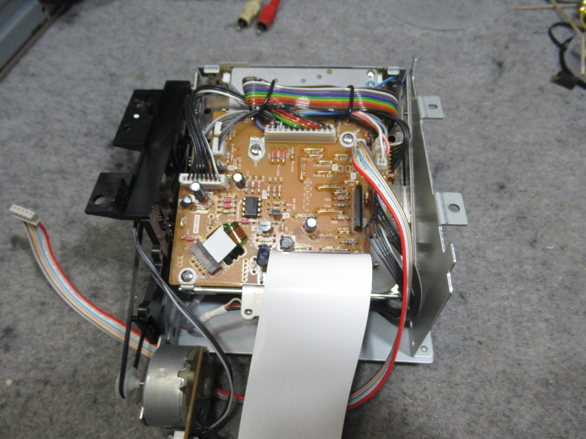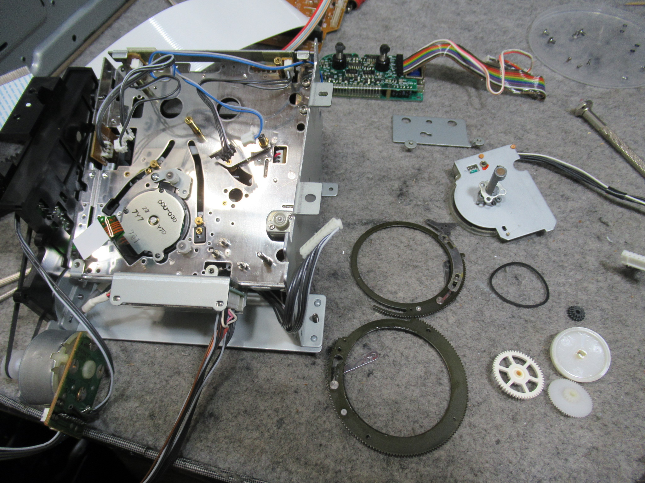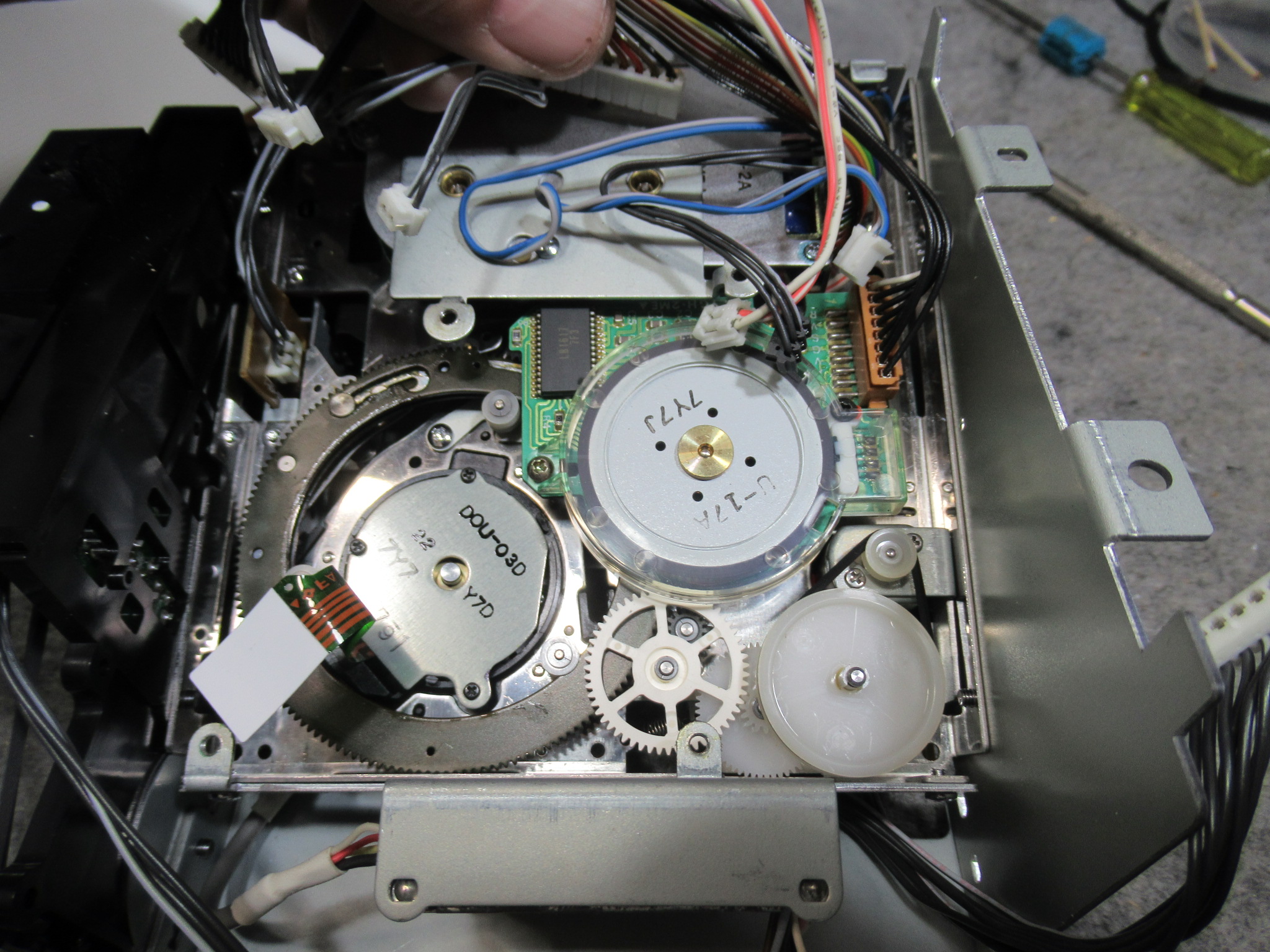 メカを降ろして、まずは、トレイ開閉の不具合の原因のひとつ、劣化したローディングベルトを交換します。