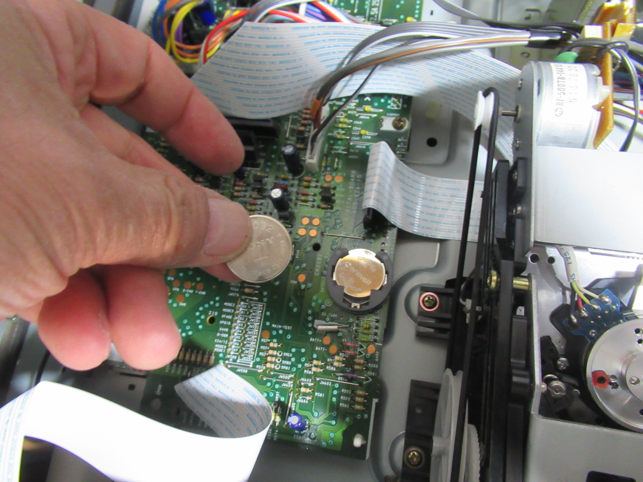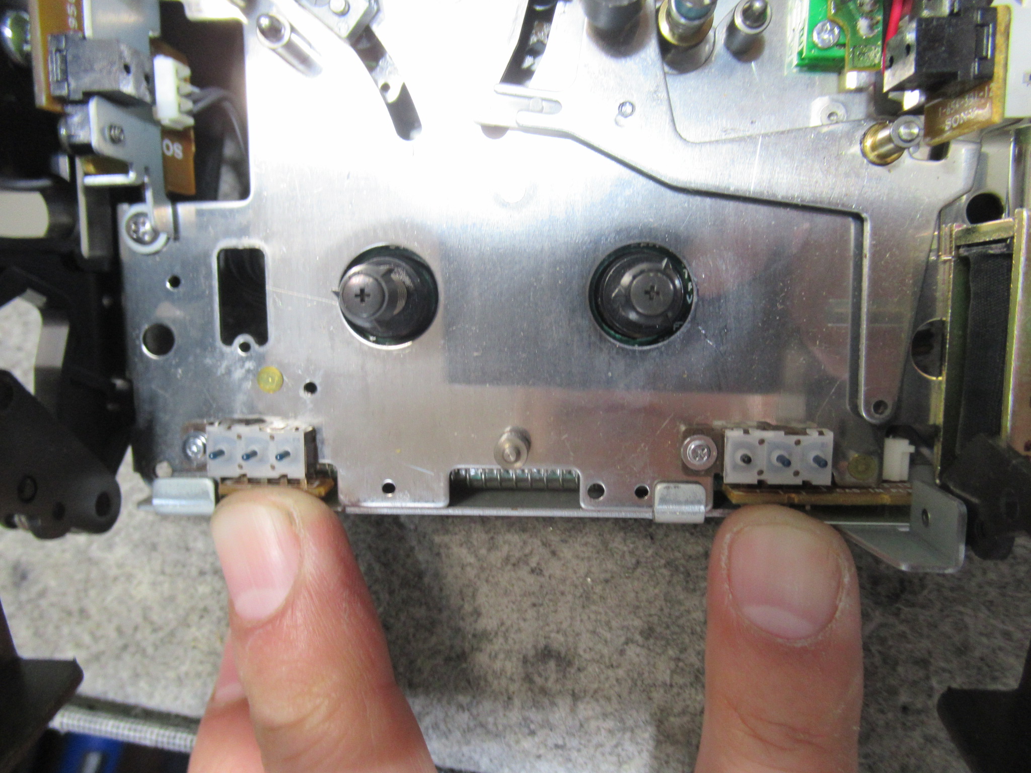 SONYのDTC-ZA5ESです。 再生速度が速い、巻き戻し不可などの不具合が発生するようになったということです。 カバーを開けました。案の定、ピンチローラーがありません。今月に入って3台連続です。 …