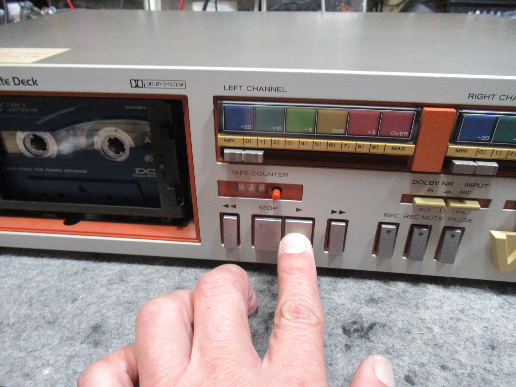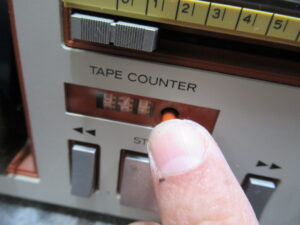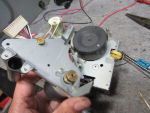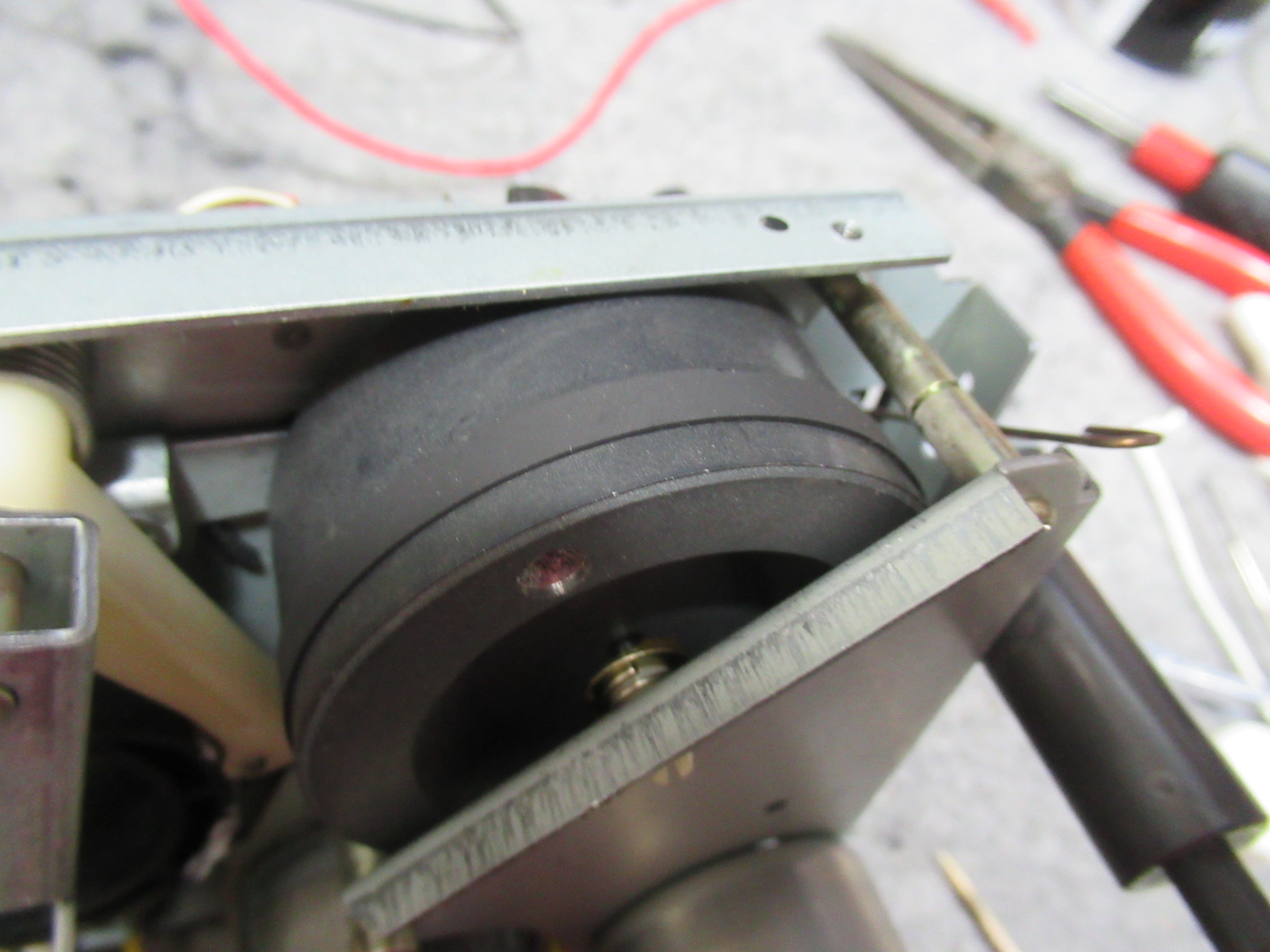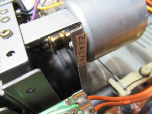 フロントパネルを取り外してカウンターユニットを取り出しましたが、ダイヤルや細かいギヤが固着していて処置のしようがありませんでしたので、修理は諦めます。ただし、カウンターにはリールの回転を検知するユニットが取り付けられていますので、固着したままではテープ走行が即停止してしまいます。そのため、検知ユニットだけは動作するよう、最低限の処置を行う必要があります。