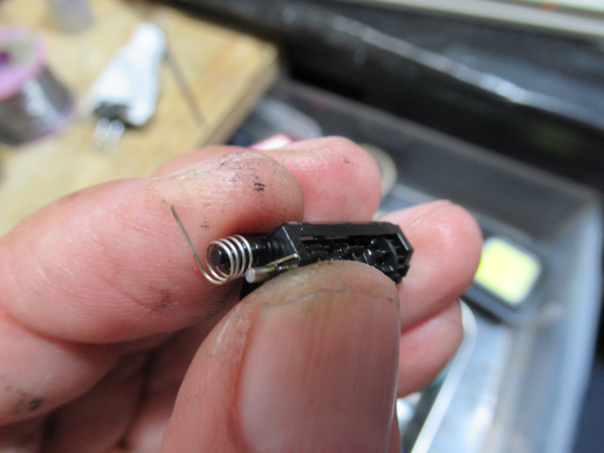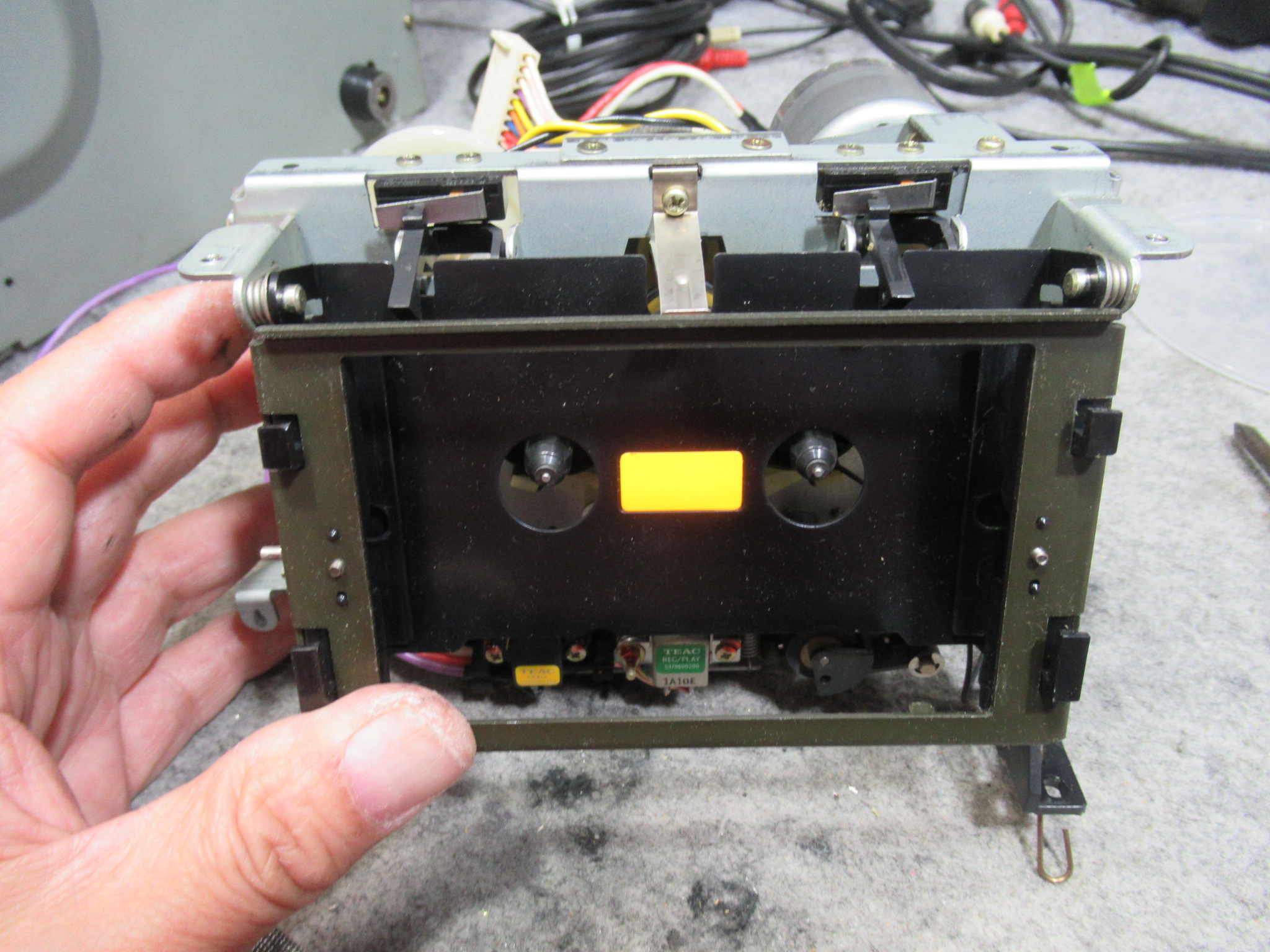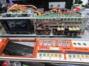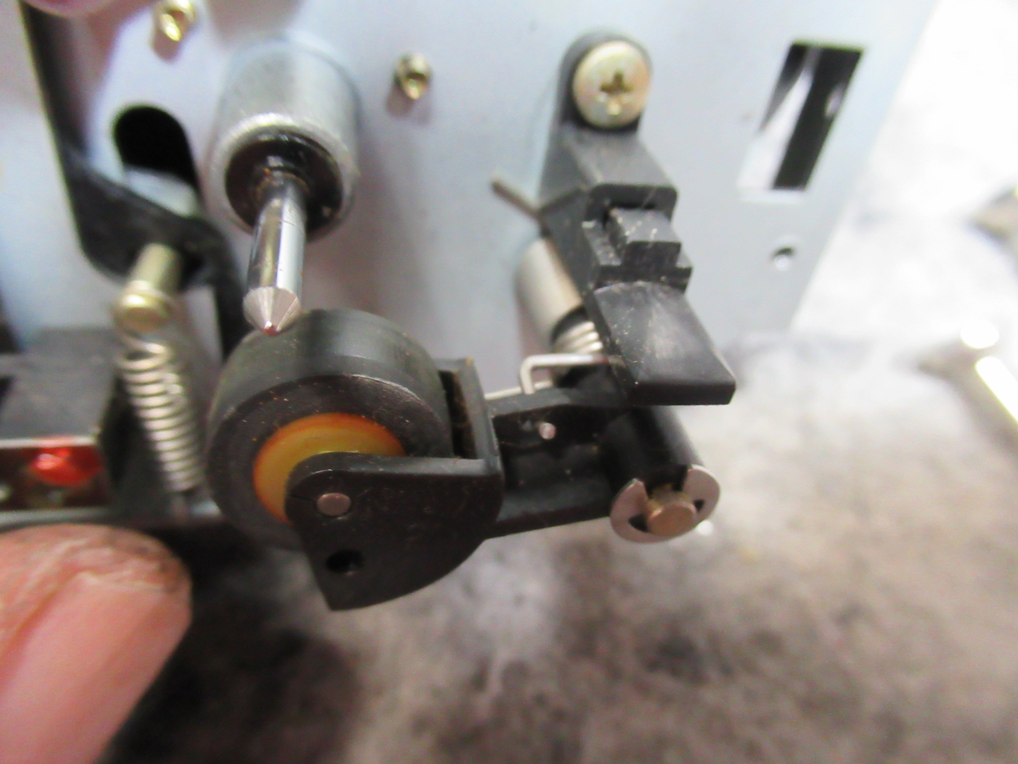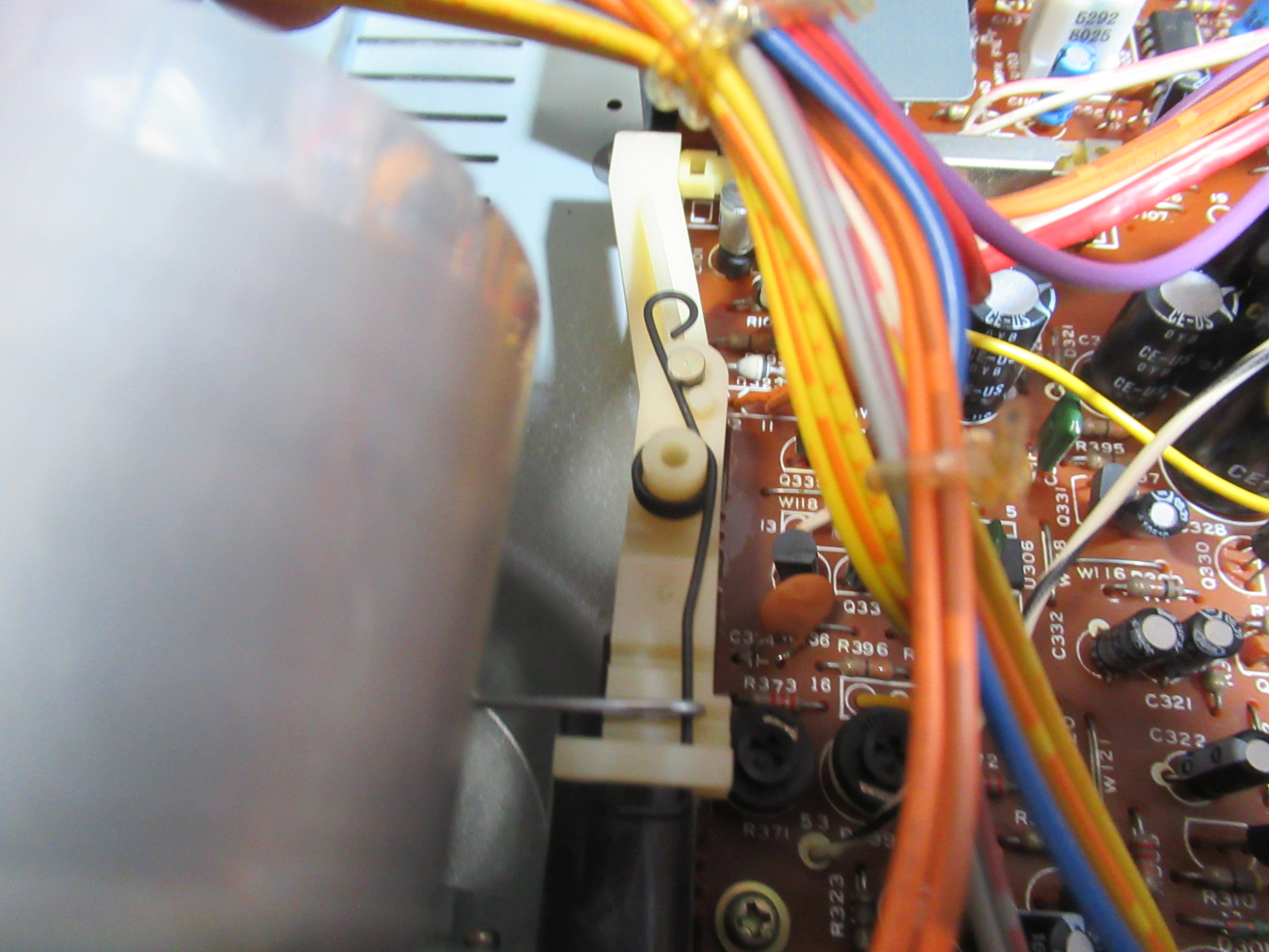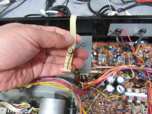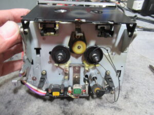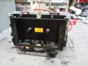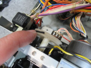 これは、メカと基板を接続するリンケージですので、メカを降ろす前に切り離す必要があります。この時代のカセットデッキの再生と録音の切り替えは、こういったレバーやワイヤーにより物理的に基板上のスイッチを動作させるのが一般的でした。