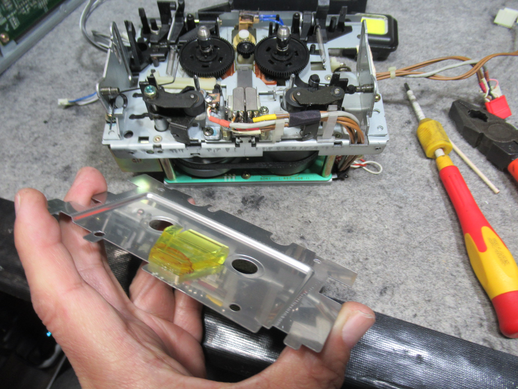 操作の誤作動は再現されませんでした。ヘッドが上がらなかったというのは、ホルダーが閉まりきっていなかったためカセットとピンチローラーが干渉していた可能性があります。