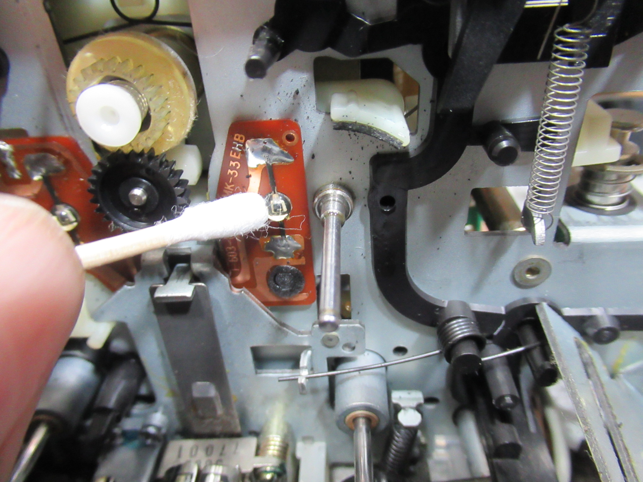 化粧パネルを取り外し、裏面に取り付けられているプリズムを磨きます。このプリズムは、カセットの窓の照明のほか、回転センサーにランプの光を導くという重要な役割がありますので、表面が曇るとオートシャットオフが働いてしまいます。